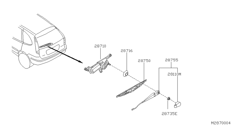 Задняя щетка стеклоочистителя (NISSAN) 28790BU010, цена ниже розничной. Номер детали на фото: 28750